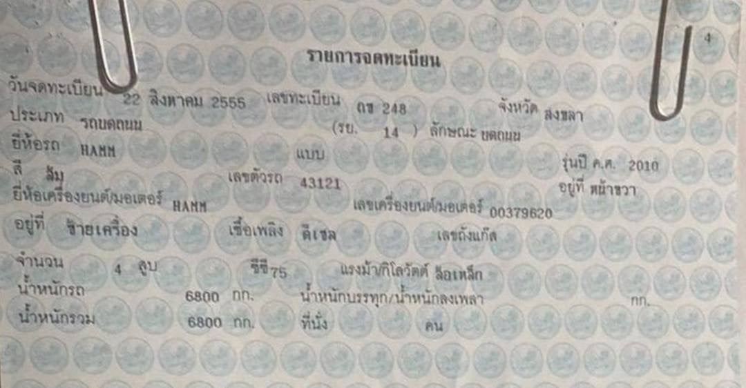 เบรคดาวน์ 7 ตัน HAMM DD70VV ทำงาน 6,606 ชั่วโมง ปี 2010 เอกสารเล่มทะเบียน